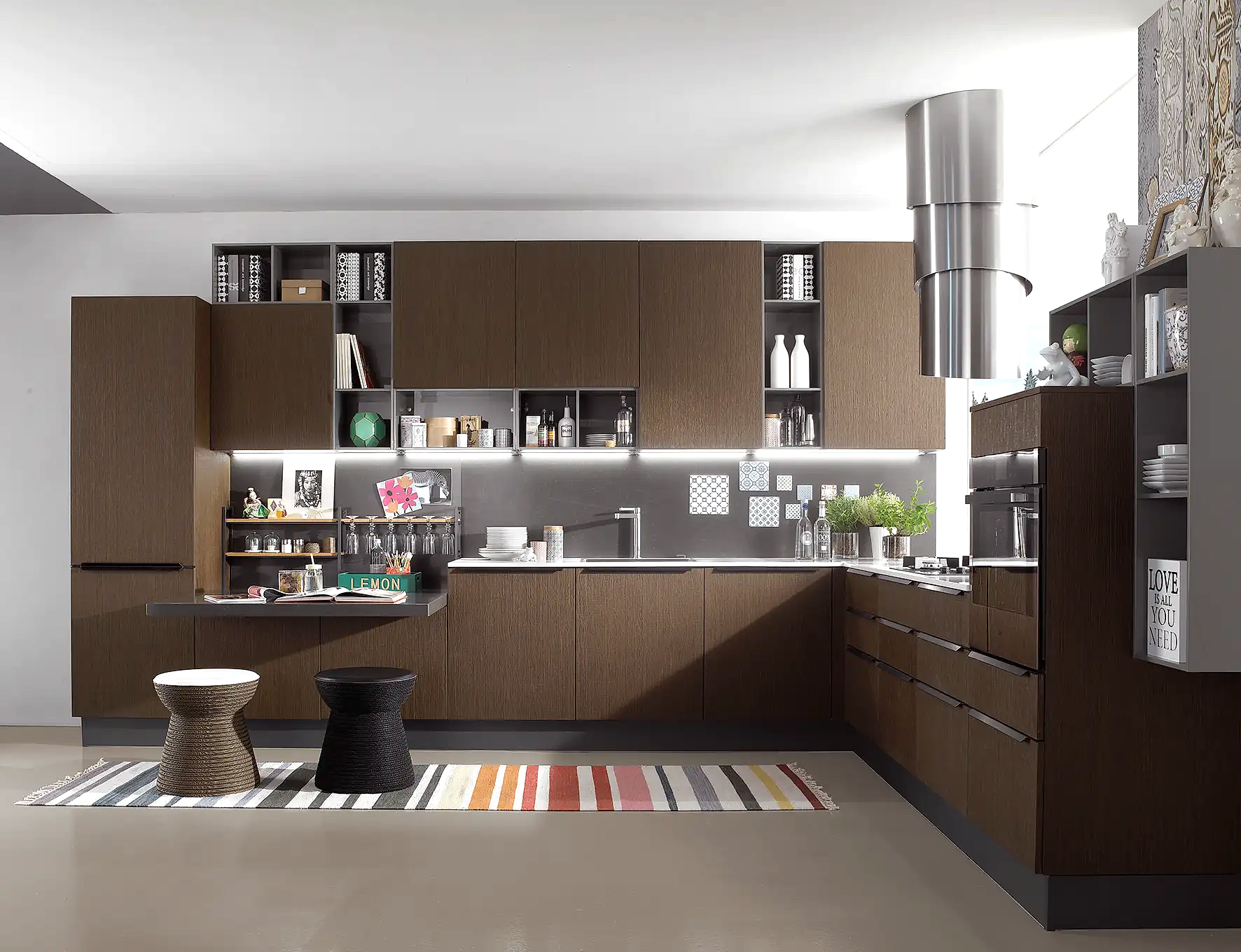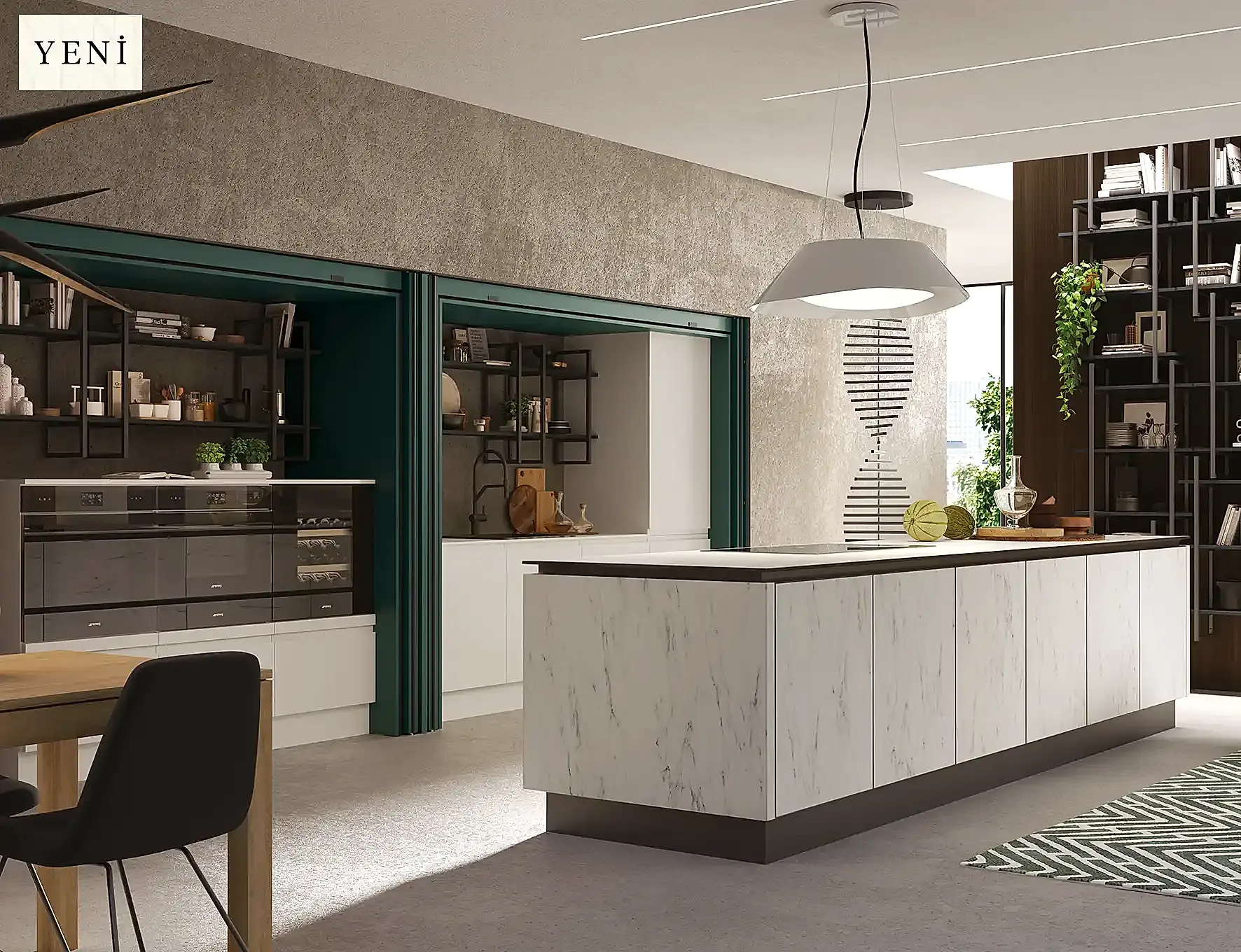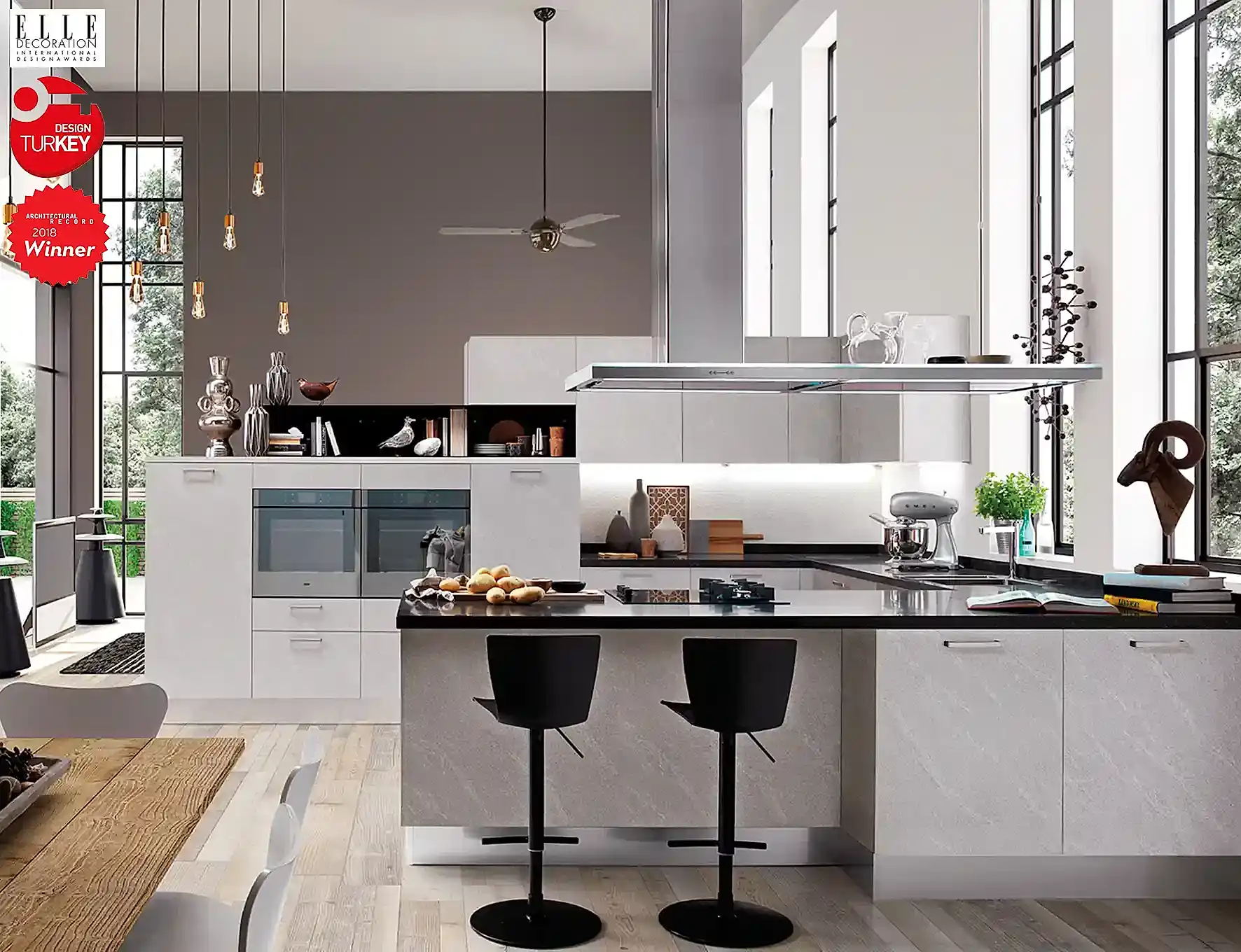 - Kulp, oturma alanı, tezgâh türü, kapak açılım sistemleri ve raf modelleri, mutfakta modern bir etki yapar.
